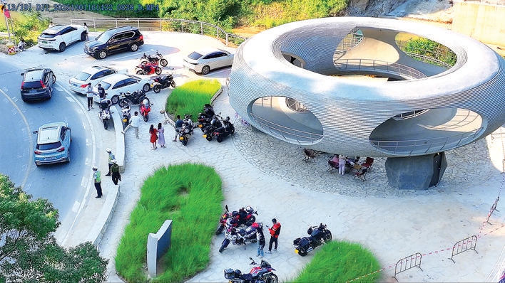 218最美旅游公路沿途設(shè)置的藝術(shù)裝置,既是網(wǎng)紅打卡點,也是游人休憩的好去處。在博羅段中,綠屏石灘藝術(shù)裝置尤為吸睛。直徑16.5米的觀景環(huán)凌空懸于峭壁邊緣,下沉廣場與漂浮平臺構(gòu)成的雙層標高景框,恰好將山水風光框成一幅流動的畫,成為游客定格美景的絕佳選擇。休憩區(qū)里,摩旅愛好者與騎行愛好者圍坐閑談,手捧特色豆花拿鐵,你一言我一語分享著沿途所見的秀麗風光。“一路風景絕了!各個驛站和藝術(shù)裝置的間距特別合理,騎累了就坐下喝杯咖啡、看看山景,這種邊騎邊玩的愜意,是其他路線比不了的。”騎行愛好者鄧先生贊不絕口。他說,騎行群里常有人分享這條公路的美景與攻略,趁著國慶假期,他立刻約上好友來一場深度體驗。羅浮山茶、東坡茶樂事等本地特色飲品,剛推出就成了游客爭先品嘗的“爆款”。