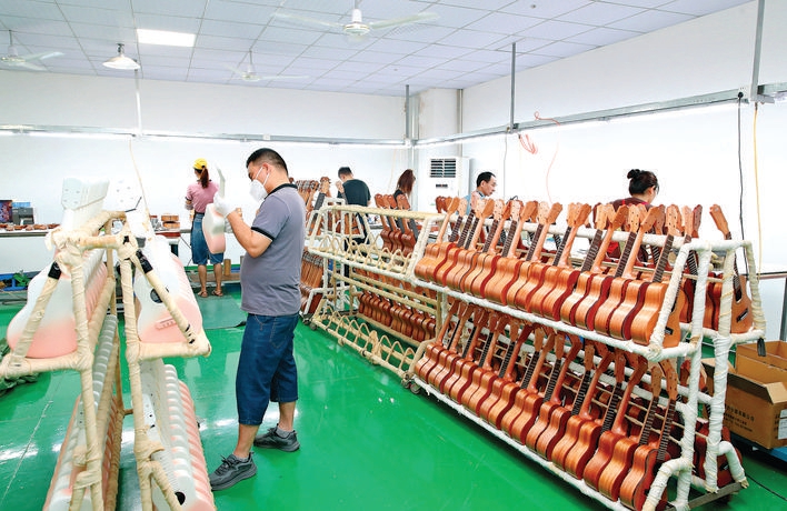 走進(jìn)惠州市湯姆樂(lè)器有限公司展廳,一把把制作精致唯美的尤克里里吸引了參觀者的眼球,這里有敦煌博物館系列聯(lián)名款吉他、荷蘭梵高博物館聯(lián)名吉他,還有皮卡丘、熊本熊等動(dòng)漫IP聯(lián)名款吉他,實(shí)現(xiàn)行業(yè)破圈,進(jìn)一步提升品牌影響力,如今尤克里里年產(chǎn)量20萬(wàn)支,成為國(guó)內(nèi)知名中高檔尤克里里品牌。“我們通過(guò)‘文化+’聯(lián)名生產(chǎn),實(shí)現(xiàn)行業(yè)破圈,讓更多人接觸吉他文化。”該公司總經(jīng)理謝寶艦說(shuō),接下來(lái)會(huì)往智能化方向發(fā)展,運(yùn)用包括碳纖維在內(nèi)的新材料制作吉他,以更好的產(chǎn)品贏得市場(chǎng)。